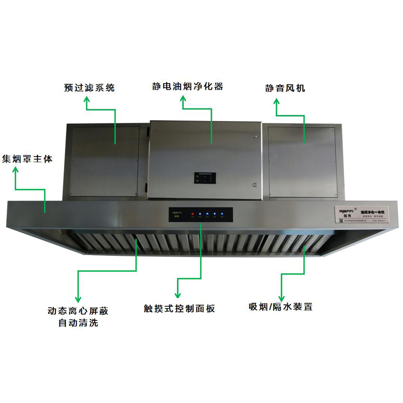 1、煙罩與凈化2合1,98%以上油煙凈化效率和90%以上除味效率,額定處理風量測試;